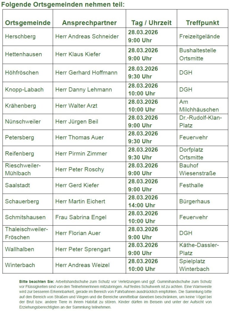 Wir laden Sie auch in diesem Jahr herzlich ein, sich am Umwelttag der Verbandsgemeinde zu beteiligen.